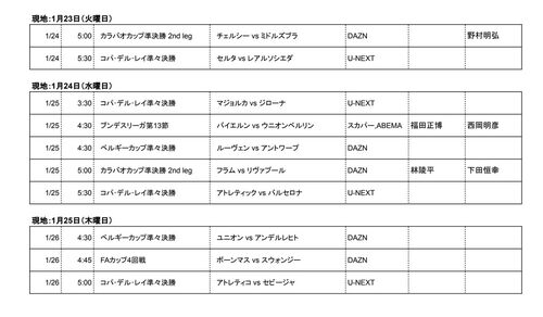 欧州サッカー放送配信リスト 2024年1月19日から1月22日